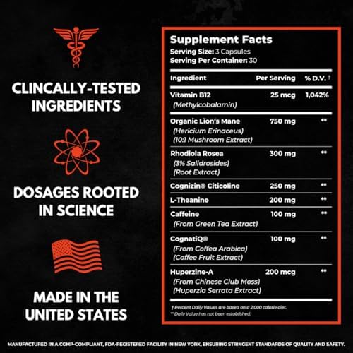 🧠 𝗘𝗡𝗛𝗔𝗡𝗖𝗘𝗗 𝗖𝗢𝗚𝗡𝗜𝗧𝗜𝗩𝗘 𝗙𝗨𝗡𝗖𝗧𝗜𝗢𝗡: Our all-natural nootropic capsules are formulated with organic Lion’s Mane Mushrooms, Rhodiola Rosea, Cognizin Citicoline, CognatiQ, Green Tea Caffeine, L-Theanine, Huperzine-A, & Vitamin B12. Specifically formulated to provide a clean, natural energy boost while also promoting mental clarity and memory support.