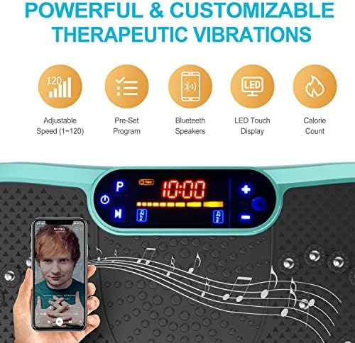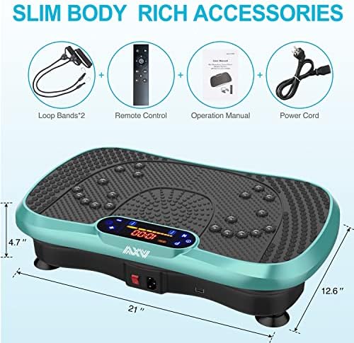 ✅WHY WE CHOOSE AXV VIBRATION PLATE: Can be connected to phone via BT and used as BT speaker; Magnet health massage function; LED display shows time, speed and burnt fat making your workout visible; Compact size can be used anywhere & easy to carry and store; Anti-slip coating designed;Enhanced upgraded Ergonomic design shell ensures more durability and stability; Comes with Remote control ,Resistance Bands and detailed manual…everything you need.