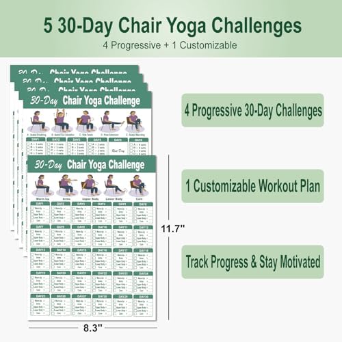 5 Chair Yoga Challenge Charts — 4 progressive + 1 customizable plan for motivation and progress.
