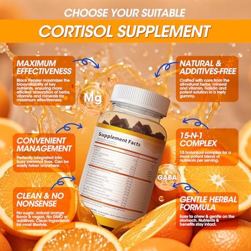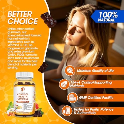 15-IN-1 COMPLEX CORTISOL GUMMIES: Our cortisol supplement combines Ashwagandha, L-Theanine, Phosphatidylserine, Rhodiola Rosea, Turmeric, Chamomile, Lion’s Mane, St. John’s Wort, and complements with Magnesium Glycinate, Vitamin C, B6, D3, GABA and PQQ to achieve true cortisol balance and enhance the overall well-being. Say goodbye to stress, imbalanced hormonal and cortisol. The best supplement to maintain ideal cortisol, make it a powerful cortisol supplement in your life