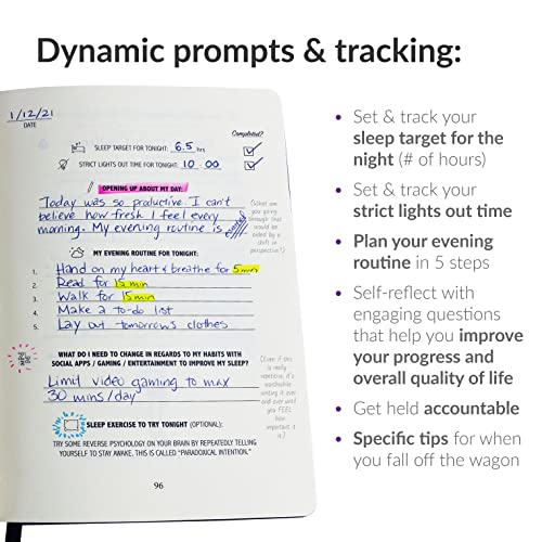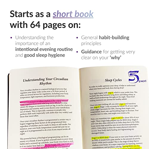 The Sleep & Evening Routine Sidekick Journal is about establishing two equally important habits: 1. Establishing a consistent, intentional evening routine. 2. Good sleep hygiene leading to good sleep quality. This is a guided journal is a sleep aid that helps you understand the importance of an intentional evening routine and good sleep hygiene. Provides you with all the resources you need to consistently perform an evening routine that fits YOUR life, along with helping you get great sleep on a regular basis. 💡 This daily journal with prompts comes with daily thought-provoking, informative & actionable content. A Comprehensive Daily Tracking System: Set and track your sleep target, lights-out time, ways to improve your sleep, your evening routine, and answer thought-provoking questions to improve the quality of your life. ⏱ Takes 5 minutes a day