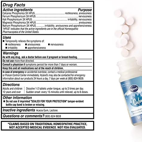 Hyland’s Calm tablets provides Natural Relief of anxiousness, nervousness, and irritability, 50 Count. Hyland’s is a leading consumer health brand with more than a century of history making high quality products to help people live healthier and happier lives. Made with natural active ingredients, our products contain no artificial flavors or sugars, dyes or parabens. With a state-of-the-art, FDA regulated and cGMP compliant facility, our top-selling products are sold in more than 15 countries and can be found in every major retailer in the United States.