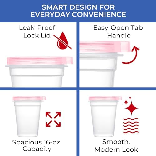 16oz Size for Versatile Large Cereal Containers Storage Airtight – These plastic food containers with lids hold 16oz of space plus 25% extra room for chunky fruits, effectively holds up to 20 oz. Ideal as salad container for lunch, parfait cups with lids or fruit storage containers for fridge.