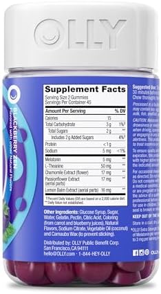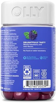 OLLY Extra Strength Sleep gummies for adults deliver a delightful blend of active ingredients that work together to promote restful sleep so you wake up feeling refreshed. These 5mg Melatonin gummies, with L-Theanine to work with your body to help you fall asleep and stay asleep.* Includes traditional Botanical Extracts like Chamomile and Lemon Balm. Deliciously flavored with Blackberry and a hint of mint with other natural flavors, these Sleep gummy supplements help you drift off. They’re delightfully tasty, scientifically formulated and gluten-free. *These statements have not been evaluated by the Food and Drug Administration. This product is not intended to diagnose, treat, cure or prevent any disease. For occasional sleeplessness. CAUTION: Melatonin may cause drowsiness or sleepiness; do not take while driving, operating machinery, or engaging in any activity that requires alertness. This product is not intended to treat insomnia or other sleep disorders.