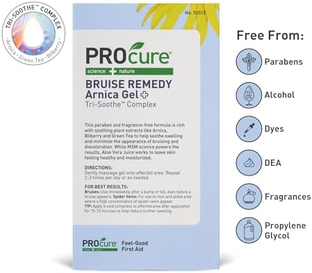 “PROcure Bruise Remedy is all-natural Arnica gel that dramatically helps improve skin discoloration due to bruising and spider veins without harsh ingredients. Use immediately after a bump or fall, even before a bruise appears. A must-have for the medicine cabinet! Bruises are the result of blood from damaged cells collecting near the skin’s surface that can take weeks to disappear. PROcure’s new Bruise Remedy Gel, containing Arnica and MSM, dramatically improves the appearance of bruises in a fraction of the time! Our non-greasy & fragrance-free formula is free from harsh ingredients. Rub a little in and encourage your body’s natural healing power. Great for bruising caused by GLP-1 medications, diabetes insulin rejections, vaccination injections and more. For best results, squeeze gel directly into a loofah or other exfoliation devices and gently buff skin to help improve appearance of spider veins & bruising. “