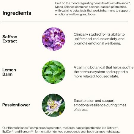 POWERED BY POSTBIOTICS & CALMING BOTANICALS: BiomeBalance postbiotics, saffron, lemon balm, magnesium, and passionflower work synergistically to help regulate your stress response, support serotonin activity, and calm the nervous system. This powerful blend helps ease mental tension, reduce brain fog, and promote relaxation, restful sleep, and balanced mood—so you wake up feeling refreshed, steady, and focused.
