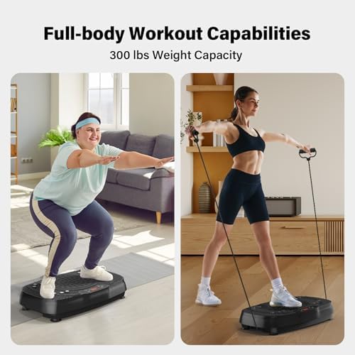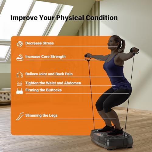 [ Feature-Rich Workout Equipment ] Manual Mode: adjustable vibration speeds (1-120) and Smart Mode: 5 preset vibrating frequencies (P1-P5), customize your vibration settings to maximize your workout efficiency. With 2 resistance bands, perform a variety of whole body exercises that promote muscle toning and fat loss. Just 10-20 minutes a day on the vibration plates can yield significant benefits.