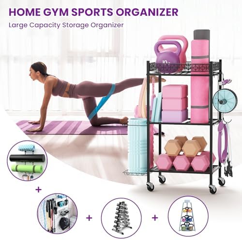 360° WHEELS and HOOKS: The home gym storage organizer has 4 universal wheels (2 of lockable), it is convenient for moving the foam roller cart and using sports equipment. There are removable hooks on the sides to hang towels, resistance bands, yoga wheels and more